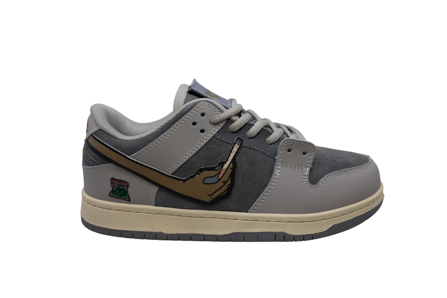 Inspired by the clean burn of a white ash—a mark of quality in a perfectly rolled blunt—this design is all about precision and premium craftsmanship. Smooth grey leather meets charcoal suede for a sharp contrast, with a hidden stash pocket tucked in the tongue. Custom, interchangeable woven tongue patches add depth to a sneaker that speaks low, but hits loud.